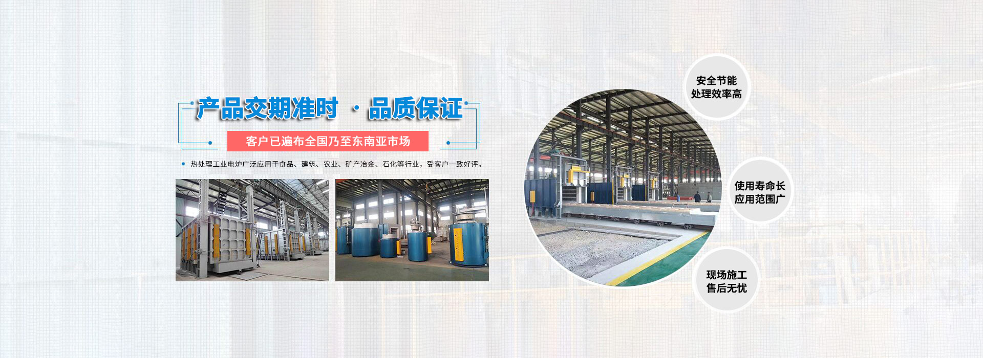 公司現有業務包括新能源電池燒結爐、連續式金剛石鋸片燒結爐、臺車爐、熱風循環爐、井式爐、罩式爐、管式爐、網帶爐、連續式滾筒爐、輥底爐、推桿爐、可傾式滾筒爐、鋼帶爐、鋁合金淬火爐、時效爐、坩堝爐、熔鋁保溫爐等。可對工件進行以電、天然氣、煤氣、工業燃油等為介質的真空、保護氣氛、控制氣氛等各種自控熱處理。